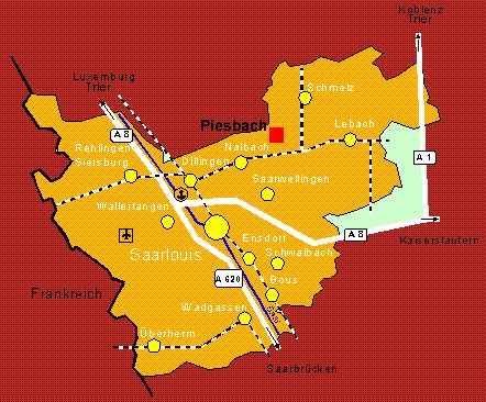 über die A 620 bis zum Autobahndreieck Saarlouis, weiter auf die A8 Richtung Neunkirchen, Abfahrt 12 Nalbach, weiter auf der B 269 Richtung Lebach, links nach Piesbach abbiegen, nächste links Hauptstraße, nächste rechts Rosengartenstraße